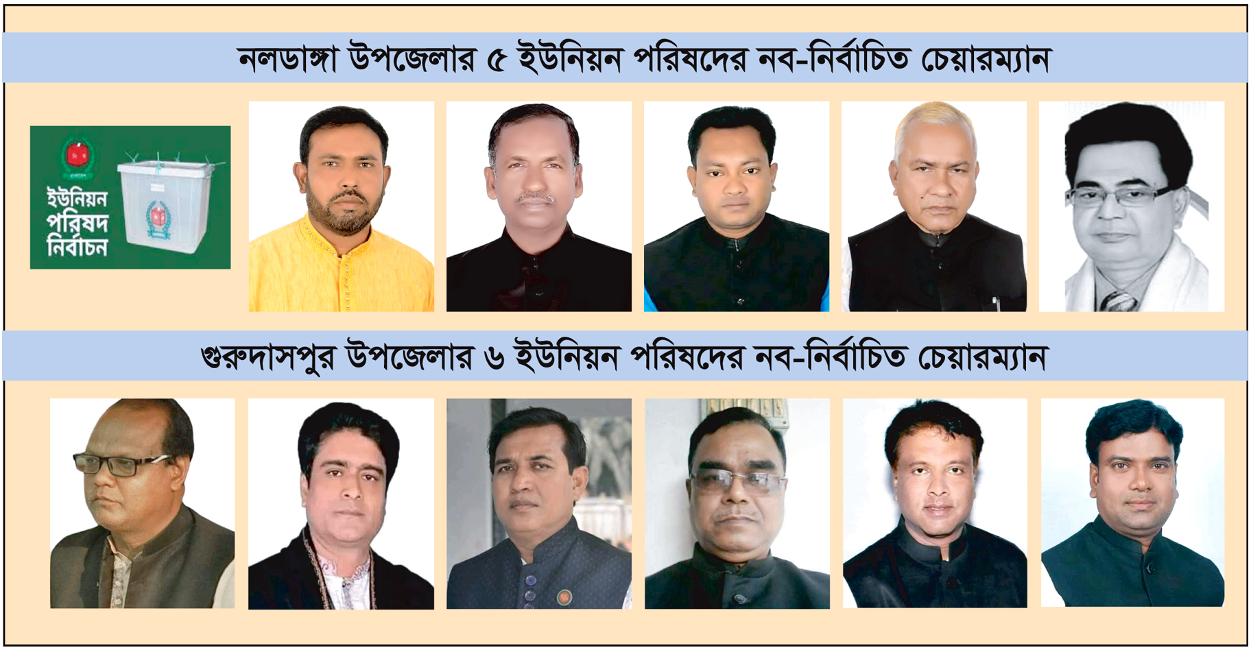 এর আগে রাত ১০টার সময় এই দুই উপজেলায় ফলাফল ঘোষণা করা হয়। নির্বাচিত ইউপি চেয়ারম্যানরা হলেন নলডাঙ্গা উপজেলায় ১ নম্বর ব্রহ্মপুর ইউনিয়ন পরিষদে আওয়ামী লীগের বিদ্রোহী প্রার্থী (স্বতন্ত্র) মো. আশরাফুজ্জামান মিঠু (আনারস প্রতীক), ২ নম্বর মাধনগর ইউনিয়নে আওয়ামী লীগের বিদ্রোহী প্রার্থী (স্বতন্ত্র) আব্দুল জব্বার মৃধা (ঘোড়া প্রতীক), ৩ নম্বর খাজুরা ইউনিয়নে আওয়ামী লীগ মনোনীত প্রার্থী মো. সোহরাব হোসেন (নৌকা), ৪ নম্বর পিপরুল ইউনিয়নে আওয়ামী লীগ মনোনীত প্রার্থী মো. কলিমুদ্দিন ( নৌকা) ও ৫ নম্বর বিপ্রবেলঘরিয়া ইউনিয়নে বিএনপি’র স্বতন্ত্র প্রার্থী মো. শাহজাহান আলী (চশমা প্রতীক)। অপরদিকে গুরুদাসপুর উপজেলায় নাজিরপুর ইউনিয়নে আওয়ামী লীগের বিদ্রোহী প্রার্থী (স্বতন্ত্র) মো. আইয়ুব আলী (মোটরসাইকেল), বিয়াঘাট ইউনিয়নে আওয়ামী লীগের বিদ্রোহী প্রার্থী (স্বতন্ত্র) মো. মিজানুর রহমান সুজা (মোটরসাইকেল), খুবজীপুর ইউনিয়নে আওয়ামী লীগ মনোনীত প্রার্থী মো. মনিরুল ইসলাম দোলন (নৌকা), মশিন্দা ইউনিয়নে আওয়ামী লীগের বিদ্রোহী প্রার্থী (স্বতন্ত্র) মো. আব্দুল বারী (ঘোড়া), ধারাবারিষা ইউনিয়নে আওয়ামী লীগ মনোনীত প্রার্থী মো. আব্দুল মতিন (নৌকা) ও চাপিলা ইউনিয়নে আওয়ামী লীগের বিদ্রোহী প্রার্থী (স্বতন্ত্র) মো. মাহাবুবুর রহমান (মোটরসাইকেল)।