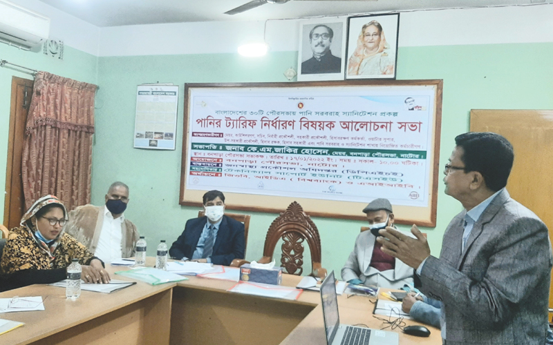 বড়াইগ্রাম প্রতিনিধি: নাটোরের বড়াইগ্রামের বনপাড়া পৌরসভায় পানি সরবরাহ প্রকল্পের পানির ট্যারিফ (মূল্য) নির্ধারণ বিষয়ক এক আলোচনা সভা অনুষ্ঠিত হয়েছে। সোমবার সকালে পৌর সভাকক্ষে জনস্বাস্থ্য প্রকৌশল অধিদপ্তরের অধীনে বাংলাদেশের ৩০টি পৌরসভায় পানি সরবরাহ প্রকল্পের টেকনিক্যাল সাপোর্ট ইউনিটের সহযোগিতায় বনপাড়া পৌরসভা এ সভার আয়োজন করে। পৌর মেয়র কেএম জাকির হোসেনের সভাপতিত্বে অনুষ্ঠিত এ আলোচনা সভায় অন্যদের মধ্যে উপস্থিত ছিলেন প্রকল্পের অর্থ ব্যবস্থাপনা স্পেশালিষ্ট মাসুদ হোসেন ও রাকিবুল হক চৌধুরী, আবাসিক পানি সরবরাহ ও স্যানিটেশন প্রকৌশলী মামুন হোসেন, বনপাড়া পৌরসভার নির্বাহী প্রকৌশলী আতাউর রহমান, সচিব আব্দুল হাই, পৌর কাউন্সিলর ও কর্মকর্তাগণ।