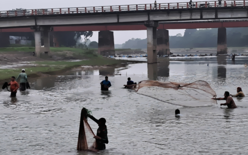 ইউএনও পার্ক সংলগ্ন বড়াল ব্রীজের নিচে গেল কয়েকদিন ধরেই সকাল থেকে বিকেল পর্যন্ত নদীতে মানুষের উপস্থিতি বেড়ে গেছে। কেউ একা, কেউ দুই-তিনজন মিলে খেওয়া জাল ফেলে মাছ ধরছেন। নদীর জলে টান পড়ছে, জালে উঠছে দেশি জাতের নানা মাছ বোয়াল, লাইকর, পুঁটি, ট্যাংরা, ছোট দেশি মাছ।