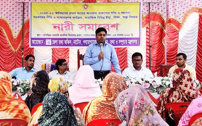 অনুষ্ঠানে নাটোর জেলা প্রাথমিক শিক্ষা অফিসার মোহাঃ আব্দুল হান্নানের সভাপতিত্বে নাটোর সদর উপজেলা নির্বাহী অফিসার মোঃ আরিফ আদনান প্রধান অতিথি হিসাবে উপস্থিত ছিলেন। নারী সমাবেশে স্বাগত বক্তব্য প্রদান করেন জেলা তথ্য অফিসার (রু.দা.) রেজওয়ান মোরশেদ। বিশেষ অতিথি হিসাবে সহকারী উপজেলা প্রাথমিক শিক্ষা অফিসার ড. মোঃ নাসিম রানা, প্রধান শিক্ষক খন্দকার রাজিয়া সুলতানা প্রমুখ উপস্থিত ছিলেন। অনুষ্ঠানে অন্যান্য অতিথিবৃন্দ টাইফয়েড টিকাদান ক্যাম্পেইন-২০২৫, তারুণ্যের শক্তি ও সম্ভাবনা, বাল্যবিয়ে, মাদক, ইভটিজিং প্রতিরোধ, স্বাস্থ্য বিষয়ক বিভিন্ন গুরুত্বপূর্ণ বার্তা, শিক্ষার গুরুত্ব, মোবাইল ফোনের সদ্ব্যবহার, নৈতিকতা ও মূল্যবোধ সম্পর্কে সচেতনতা প্রভৃতি বিষয় নিয়ে বক্তব্য প্রদান করেন। অনুষ্ঠানটি সঞ্চালনা করেন নাটোর জেলা তথ্য অফিসের ঘোষক মানিক সরকার।