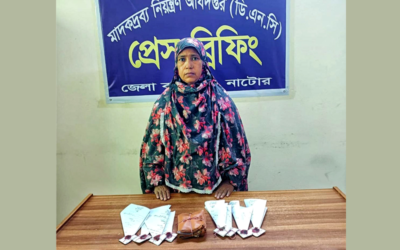 মাদকদ্রব্য নিয়ন্ত্রণ অধিদপ্তর, জেলা কার্যালয়, নাটোর সূত্রে জানা যায়, শুক্রবার (২৭ ফেব্রুয়ারি) সকালে নাটোর সদর থানাধীন তোকিয়া গ্রামীণ টাওয়ারের পূর্ব পাশে রাজশাহী-নাটোর মহাসড়কের পশ্চিম পার্শ্বে অভিযান পরিচালনা করা হয়। এ সময় নাটোরগামী একটি নম্বরবিহীন ব্যাটারিচালিত অটোরিকশার সিটে বসা এক নারীকে সন্দেহজনক মনে হলে তার দেহ তল্লাশী করা হয়। তল্লাশীকালে ওই নারীর ডান হাতে থাকা দারুচিনি রঙের একটি লেদারের পার্স ব্যাগের ভেতর থেকে ৩টি নীল রঙের জিপারযুক্ত পলিপ্যাকেটে মোট ৬০০ পিস ইয়াবা ট্যাবলেট উদ্ধার করা হয়, যার মোট ওজন ৬০ গ্রাম। এছাড়াও একই পার্সের ভেতর থেকে সাদা পলিথিনে মোড়ানো ১০ গ্রাম হেরোইন উদ্ধার করা হয়।