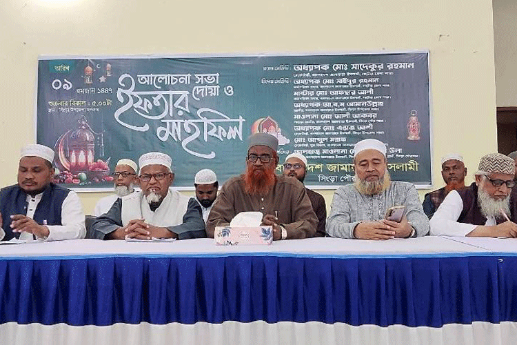 সিংড়া পৌর জামায়াতে ইসলামীর আমির মাওলানা সাদরুল উলার সভাপতিত্বে অনুষ্ঠানে প্রধান অতিথি হিসেবে উপস্থিত ছিলেন জেলা জামায়াতে ইসলামীর সেক্রেটারি অধ্যাপক সাদেকুর রহমান। অনুষ্ঠানে প্রধান অতিথির বক্তব্যে অধ্যাপক সাদেকুর রহমান বলেন, পবিত্র মাহে রমজান আত্মশুদ্ধি, সংযম ও তাকওয়া অর্জনের মাস। এই মাসে আল্লাহর সন্তুষ্টি অর্জনের জন্য বেশি বেশি ইবাদত-বন্দেগি করার পাশাপাশি সমাজে ন্যায়, ইনসাফ ও মানবিক মূল্যবোধ প্রতিষ্ঠায় সবাইকে কাজ করতে হবে। তিনি বলেন, একটি সুন্দর, ন্যায়ভিত্তিক ও কল্যাণমুখী সমাজ গঠনে ইসলামের আদর্শ অনুসরণ অপরিহার্য। সভাপতির বক্তব্যে মাওলানা সাদরুল উলা বলেন, রমজান আমাদের আত্মসংযম ও আত্মত্যাগের শিক্ষা দেয়। এই মাসে ধনী-গরিবের ভেদাভেদ ভুলে সবাইকে একে অপরের পাশে দাঁড়াতে হবে। তিনি সমাজে শান্তি, সম্প্রীতি ও নৈতিকতা প্রতিষ্ঠায় ইসলামের সুমহান আদর্শ বাস্তবায়নের আহ্বান জানান। আলোচনা সভায় জেলা জামায়াতের নেতা প্রফেসর সাইদুর রহমান সহস্থানীয় জামায়াতে ইসলামী ও সহযোগী সংগঠনের বিভিন্ন পর্যায়ের নেতাকর্মীরা উপস্থিত ছিলেন। আলোচনা শেষে দেশ, জাতি ও মুসলিম উম্মাহর কল্যাণ কামনায় বিশেষ দোয়া ও মোনাজাত পরিচালনা করা হয়। পরে উপস্থিত সবার মধ্যে ইফতার পরিবেশন করা হয়।