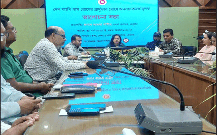 প্রান্তজন রিপোর্ট: জেলায় হামের প্রাদুর্ভাব প্রতিরোধে জনসচেতনতা সভা অনুষ্ঠিত হয়েছে। মঙ্গলবার সকাল দশটায় জেলা প্রশাসকের সম্মেলন কক্ষে আয়োজিত সভায় সভাপতিত্ব করেন জেলা প্রশাসক আসমা শাহীন।